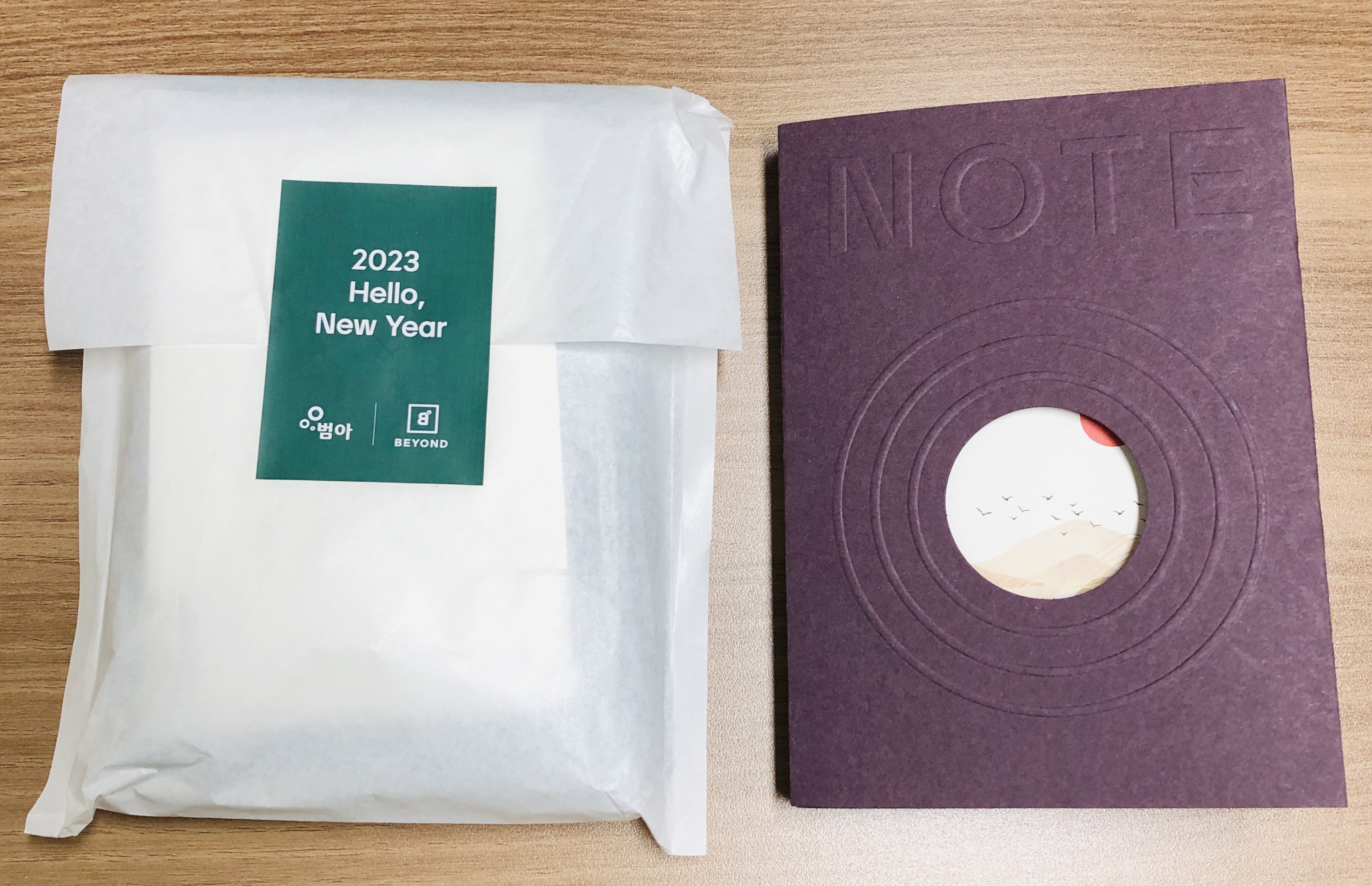 노트가 담긴 흰 봉투는 노루지를 사용하였습니다. 2023 Hello, New Year라는 텍스트가 들어간 스티커는 아트지입니다.