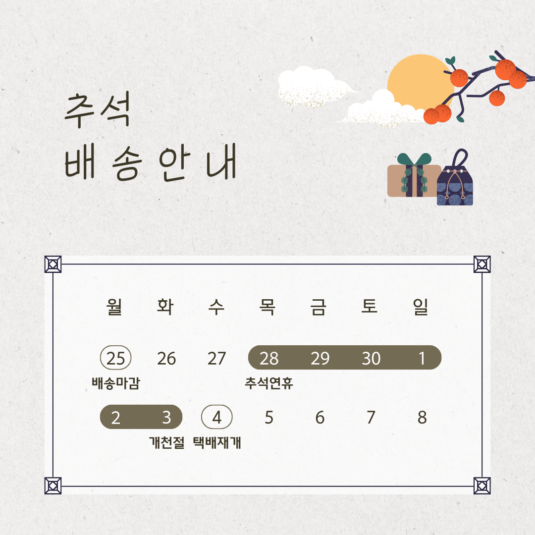 명절 택배 물량 증가로 배송이 조금씩 지연될 수 있습니다. 참고하시고 이용해주실 것을 부탁드립니다.